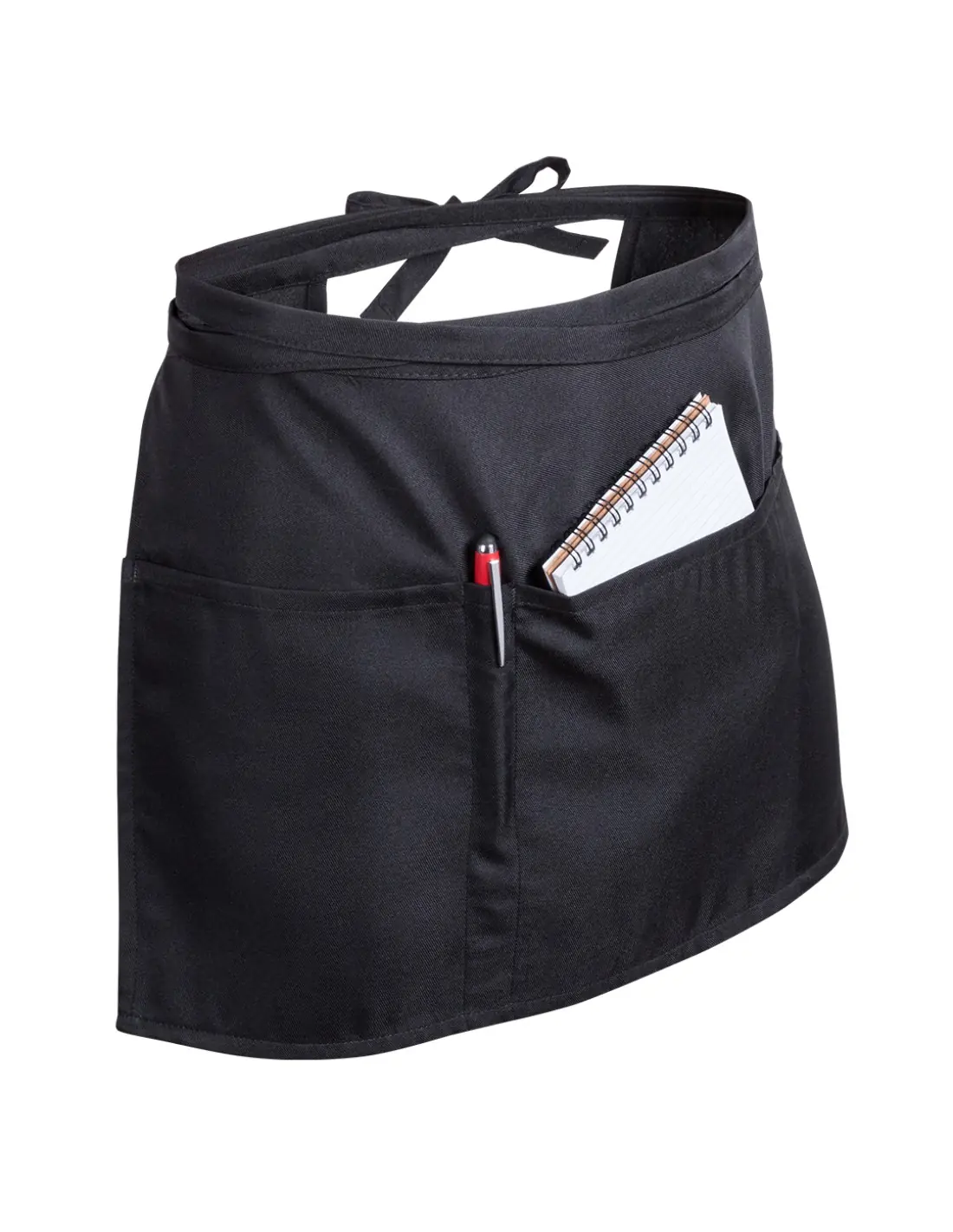 Delantal para cintura en material 100% poliéster de suave acabado en elegante color negro. Con 2 bolsillos grandes, bolsillo mediano y funda par bolígrafo. Ajustable mediante cintas.