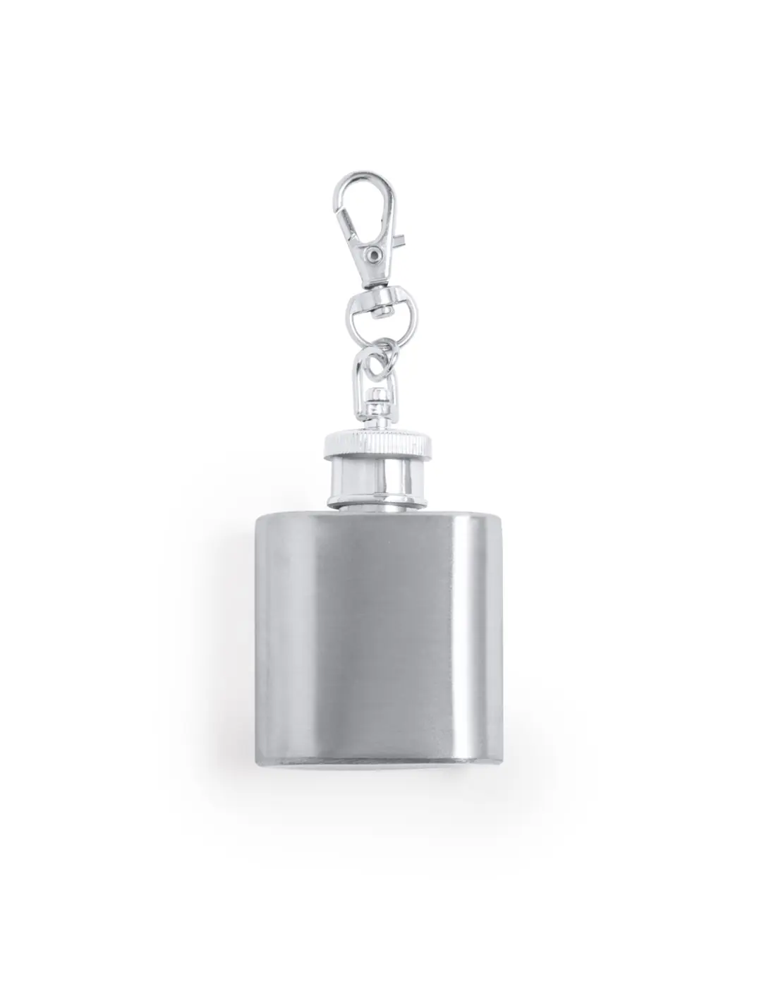 Práctico llavero petaca fabricado en acero inox, de 30 ml de capacidad. Tapón con cierre de seguridad a rosca y mosquetón giratorio. Presentado en caja de diseño kraft.
